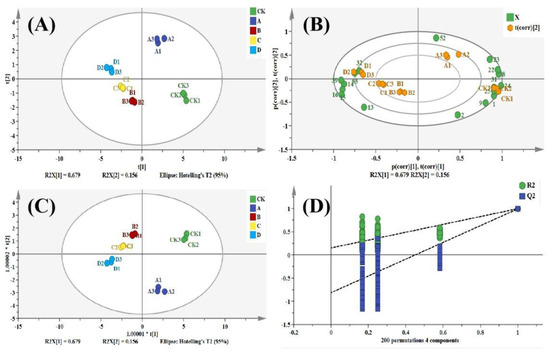 PCA and OPLS−DA analysis of key flavor components in pomegranate seeds at different processing temperatures. (A) PCA score scatter plot; (B) PCA biplot; (C) OPLS-DA score scatter plot; (D) OPLS-DA model validation plot.