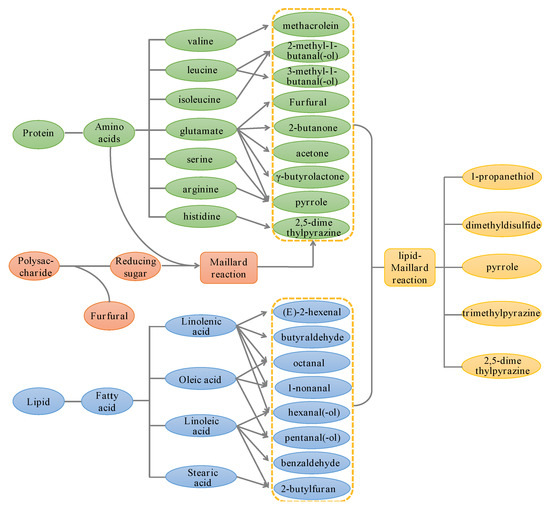 The lipid–Maillard reaction is another means of flavor formation, which mainly generates nitrogen-containing, sulfur-containing, and other heterocyclic compounds [33,37]. The interactions between the lipid and Maillard reaction products are the sources of many flavor compounds; 2,5-dimethylpyrazine, trimethylpyrazine, pyrrole, dimethyl disulfide, and 1-propanethiol can be produced by this pathway.