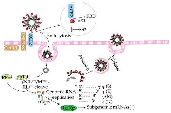 SARS-CoV-2 (Figure 1) is a positive-stranded RNA virus with four main structural proteins: the spike protein (S protein), the membrane protein (M protein), the envelope protein (E protein), and the nucleocapsid coat protein (N protein) in addition to some nonstructural proteins (nsps) [29,30,31]. The spike protein is in the outer layer of the virus and has two subunits, S1 and S2. The receptor-binding domain (RBD) of the S1 subunit binds to the ACE2 receptor of the host cell and then, with the involvement of cellular proteins, such as transmembrane serine protease 2 (TMPRSS2), cathepsin B/L (CatB/L), and flavoprotein, fuses with the cell membrane by the S2 subunit and enters the host cell [32,33,34,35]. Upon entry into the cell, the virus produces the polyproteins, 1a and 1b (pp1a and pp1ab) [36]. This is immediately followed by cleavage by 3CLpro, also called main protease (Mpro), and PLpro into 16 nonstructural proteins (nsps) [37,38]. The RdRp is an essential enzyme that can participate in RNA replication and negative-stranded RNA synthesis. The synthesized negative-stranded RNA can be used as a model for mRNA synthesis. The mRNA is translated into a polypeptide chain, which is modified and processed into four structural proteins [39,40]. The viral RNA is wrapped in the N protein and released from the cell by cytokinesis (Figure 2) [41,42,43].