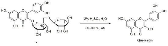 The synthesis route of quercetin is as follows (Figure 4): 2% H2SO4/H2O is added to rutin 1, reacted at 80–90 °C for 4 h, and then filtered; then, the filter cake is washed with water to neutral, then recrystallized in ethanol to provide quercetin [46].