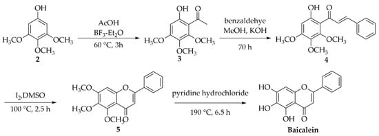 The synthesis route of baicalein is as follows (Figure 5): Compound 3 is obtained by the reaction of trimethoxyphenol 2 with AcOH and BF3-Et2O at 60 °C for 3 h, which is further condensed with benzaldehyde for 70 h to provide compound 4. Next, compound 4 is subjected to intramolecular cyclization in the presence of I2/DMSO at 100 °C for 2.5 h to provide compound 5; then, the methyl group is removed using pyridine hydrochloride at 190 °C for 6.5 h to provide baicalein [47].