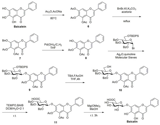 The synthesis route of baicalin is as follows (Figure 6): Using baicalin as the starting material, the acetylation reaction is carried out in the presence of Ac2O and AcONa at 80 °C to obtain acetylated baicalin 6. The acetylated baicalin is refluxed with BnBr in acetone by heating in the presence of KI and K2CO3 to yield the benzyl-substituted compound 7. The obtained compound 7 is removed from the benzyl group in THF by the action of Pd(OH)2 with H2 to provide compound 8. Additionally, compound 8 is glycosylated with brominated D-glucose in the presence of Ag2O at room temperature to provide glycosylated product 9. The removal of the protecting group TBDPS of compound 9 with AcOH and TBAF for 4 h provides compound 10. The subsequent oxidation of the hydroxyl group of compound 10 with TEMPO and BAIB at room temperature provides product 11. Finally, the protecting group is removed using Mg(OMe)2 at room temperature for 3 h to provide the target compound baicalin [48].