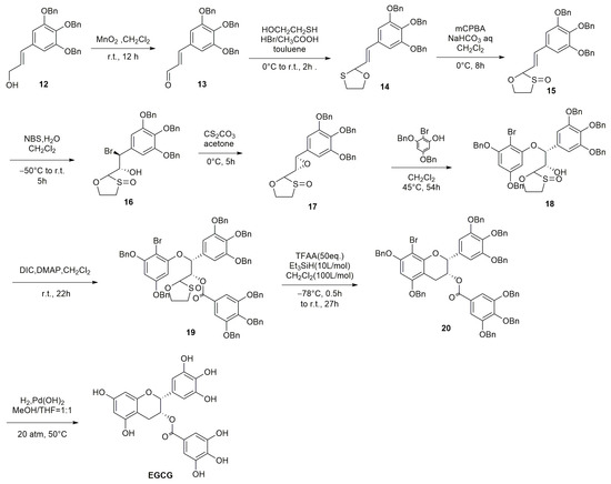 The synthetic route of EGCG is as follows (Figure 7): Compound 12, containing allyl alcohol, is oxidized by MnO2 at room temperature for 12 h to provide compound 13. In the presence of HBr, the aldehyde group of compound 13 is cyclized with HOCH2CH2SH to form cyclic S, O-acetal compound 14. Then, the oxidation of compound 14 with mCPBA at 0 °C for 8 h provides the oxidized S, O-acetal 15. The additional reaction with compound 15 in the presence of H2O is carried out with NBS to provide the bromohydrin compound 16 with stereoisomerism. The brominated alcohol of compound 16 is converted to epoxide 17 by CsCO3 in a reaction at 0 °C for 5 h. Additionally, the phenol-containing compound 21 is reacted with compound 17 at 45 °C to provide the cis-ring-opening product 18. In the presence of DIC, the alcohol hydroxyl group of compound 18 is esterified using DMAP; subsequently, the esterified product 19 is treated with an excess of TFAA in the environment of Et3SiH, and DCM (1:10) is reacted first at −78 °C for 0.5 h and then at room temperature for 27 h to provide the cyclized product 20. Finally, the protecting group of compound 20 is removed using H2/Pd(OH)2 at 20 atm to obtain the final product EGCG [49].