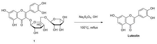 The synthesis route of luteolin is as follows (Figure 8): rutin 1 is used as the starting material, the protective agent Na2S2O4 is added, and the target product luteolin is refluxed at 100 °C [50].
