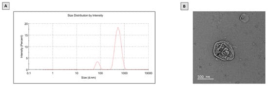 Initially, we investigated the features of the prepared PTL-phytosomes, including size and structural morphology (Figure 1). The prepared phytosomes show a z-average size of 407.4 and a polydispersity index (PDI) of 0.600 (Figure 1A). PDI, ranging from 0 to 1, is considered an indicator of the homogeneity of size distribution. The smaller the PDI, the more homogenous the nanoparticulate formulation. PDI values of less than 0.05 indicate monodispersed samples, PDI of less than 0.3 are considered to have narrow and homogenous size distribution, while values >0.7 indicate a broad-sized system [41,42,43]. Accordingly, the prepared phytosomes could have acceptable homogeneity. Furthermore, the PTL-phytosomes were characterized by Transmission Electron Microscopy (TEM) analysis (Figure 1B). The TEM photograph of the prepared PTL-phytosomes revealed that the phytosome’s surface morphology showed oval particles with multiple edges.