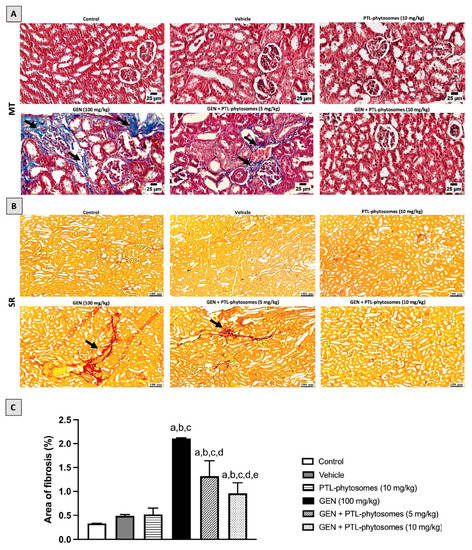 PTL-phytosomes alleviated GEN-induced kidney fibrosis. Photomicrographs of kidney sections stained with MT and SR stains to double confirm interstitial fibrosis. (A,B) In the MT- and SR-stained sections, GEN caused collagen deposition in the renal parenchyma (black arrows), characteristic of interstitial fibrosis. In contrast, treating with PTL-phytosomes (5 mg/kg) with GEN showed minimal collagen deposition. Moreover, PTL-phytosomes (10 mg/kg) + GEN co-administration showed a normal histological picture of the renal parenchyma. Scale bars, 25 and 100 μm. (C) Semi-quantitative assessment of renal fibrosis area. Data are expressed as Mean ± SD (n = 6). a: significant when compared to control at p < 0.05; b: significant when compared to vehicle at p < 0.05; c: significant when compared to PTL-phytosomes at p < 0.05; d: significant when compared to (GEN)-alone at p < 0.05; e: significant when compared to GEN + PTL-phytosomes (5 mg/kg) at p < 0.05.