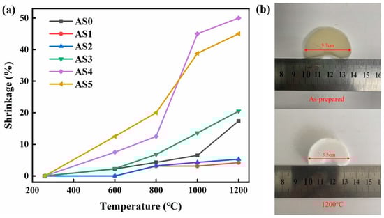 (a) The linear shrinkage of AS samples after heat treatment; (b) digital photos of AS1 before and after 1200 °C heat treatment.