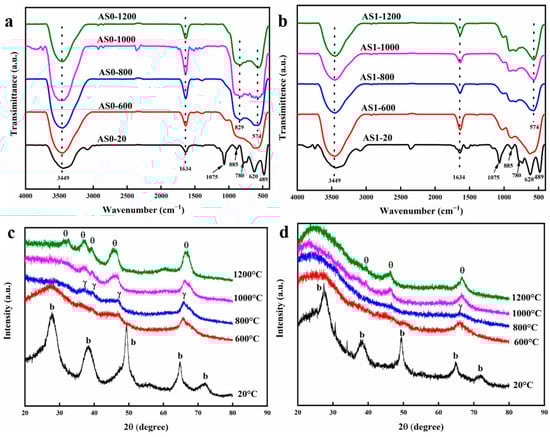 Figure 5a, b show the variation in chemical bonds of the AS0 and AS1 samples after heat treatment from 20 to 1200 °C. As shown in Figure 5a, AS0 mainly presents as the boehmite phase at room temperature after the supercritical drying process. The peaks at 3449 and 1634 cm−1 correspond to the stretching and bending vibrations of the physically adsorbed water, respectively. The bands at 1075 cm−1 correspond to the vibration modes of Al-OH in the boehmite crystal phase. The bands at 885, 780, 620 and 489 cm−1 also correspond to the vibration mode of Al-O-Al and torsional vibration, stretching vibration and bending vibration of Al-O in the boehmite crystal [,,], respectively. When the heat-treated temperature rises above 600 °C, the characteristic infrared peaks corresponding to the boehmite phase of AS0 all disappear, indicating that the crystal phase transition of alumina aerogels has taken place. All these absorption bands of the pseudo-boehmite structure disappear after heat treatment at 600 °C, followed by the emergence of broad adsorption bands in the low-frequency region of 500–900 cm−1 [,,]. With the further increment of temperature, the absorption band of Al2O3 aerogel becomes wider, indicating that its crystallinity is improved. After heat treatment at 800 °C, there are two wide absorption peaks at 574 and 829 cm−1, which correspond to the vibration modes of Al-O in the θ-Al2O3 phase, indicating the appearance of a partial θ-Al2O3 crystal phase. In the process of heat treatment, the characteristic absorption peaks of 448 and 637 cm−1 corresponding to α-Al2O3 do not appear all the time, indicating that there is no α-Al2O3 crystal phase, and the alumina AS0 sample shows good thermal stability []. As shown in Figure 5b, the Al2O3-SiO2 aerogel AS1 also presents as the boehmite crystal phase at room temperature. When the heat-treated temperature rises to 600 °C, the characteristic infrared peaks corresponding to the boehmite phase of AS1 also disappear, and a wide absorption band corresponding to the γ-Al2O3 crystal appears. The infrared peaks of AS1 hardly change in the subsequent heating process, indicating that the addition of SiO2 effectively inhibits the phase transition of alumina aerogels and keeps the alumina aerogels intact, which is consistent with the previous linear shrinkage of only 5% at 1200 °C.