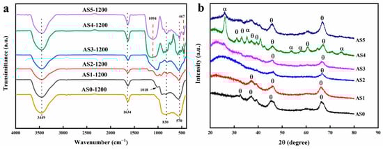 Fourier transform infrared spectrometer (FTIR) (a) and X-ray diffraction (XRD) pattern (b) of all AS samples after heat treatment at 1200 °C.