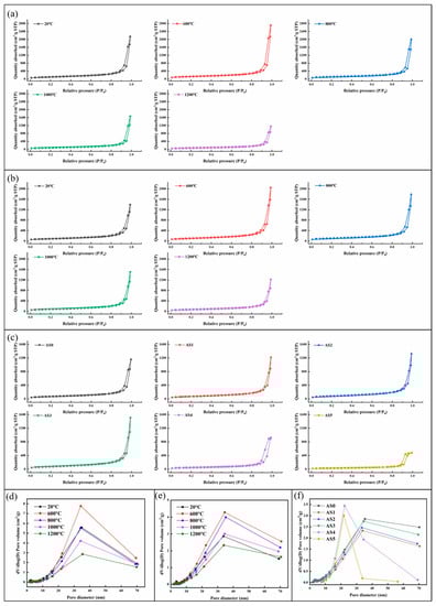 N2 adsorption–desorption isotherms of (a) AS0, (b) AS1 and (c) all AS samples after heat treatment at 1200 °C; pore size distribution of (d) AS0, (e) AS1 and (f) all AS samples after heat treatment at 1200 °C.