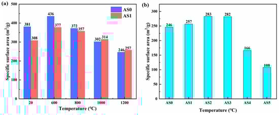 Specific surface area (SSA) of (a) AS0 and AS1 samples after heat treatment from 20 to 1200 °C and (b) all AS samples after heat treatment at 1200 °C.