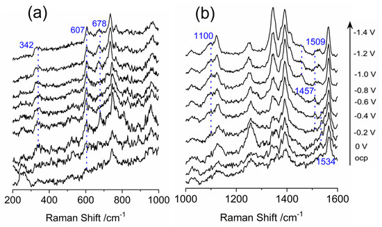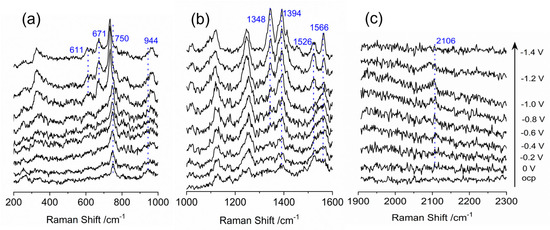 In Figure 2, the SERS spectra of a nanostructured Au working electrode modified with cobalt protoporphyrin in a N2–aturated room temperature ionic liquid are compared at different applied potentials. The characteristic vibrations of cobalt protoporphyrin are predominantly located in the range of 200–1700 cm−1 and are analyzed within this specific range. The applied potentials range from open circuit potential (OCP) to −1.5 V, with a measurement interval of 0.1 V, while the spectra are presented with a 0.2 V interval to prevent any overlap of spectroscopic signals. In Figure 2a, SERS spectra are presented for adsorbed cobalt protoporphyrin in the band range of 200–1000 cm−1. Previous literature has shown that specific vibrational modes of the porphyrin ring of hemin can undergo frequency shift based on the oxidation state, axial ligation, or coordination, and spin state of the central iron atom [33,34,35,36,37]. Typically, the ν(C–C) and ν(C–N) stretch vibrations of the porphyrin ring shift in frequency according to the iron oxidation state and can be found in the marker band range of 1300–1700 cm−1. In the case of hemin, the ν4 vibration mode corresponds to C–N stretch vibrations of the pyrrole subunits, which are sensitive to electron transfer in the π* orbital of the porphyrin ring and serve as an indicator of the iron oxidation state [38]. The typical ν4 vibration mode for ferric (Fe3+) and ferrous (Fe2+) hemin can be observed in the frequency range of 1368–1377 cm−1 and 1344–1364 cm−1, respectively [39,40]. The ν2 marker vibration mode corresponding to the ν(C–C) stretch vibration of porphyrin ring, serves as another indicator of the coordination and spin state of the Fe2+/Fe3+ ions in hemin [41]. The bands at 1570 and 1574 cm−1 are mostly related to five-coordinated ferric hemin with high spin state, while bands at 1619 and 1607 cm−1 are likely correlated with ferrous hemin [42].