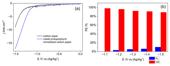 The electrochemical measurements were performed using a potentiostat (CHI 660e) and a home-made conventional three-electrode configuration. The working electrode was the cobalt protoporphyrin immobilized Ag electrode as working electrode, while the counter electrode was a Pt wire. The reference electrode used was an Ag/Ag+ reference electrode that was prepared according to literature [61]. Prior to the experiments, all glassware was immersed in piranha solution (3:1 concentrated H2SO4/30% H2O2), washed with deionized water and dried with N2. The supporting electrolyte used was a 25 mL ionic liquid solution. Additionally, the influence of water on the electrochemical reduction in CO2 was investigated using supporting electrolyte consisting of a mixture of IL solution and water in a 9:1 volume ration. The electrochemical measurements have been conducted in a three-electrode H-cell as employed with a L-shaped carbon paper (active size is 1 × 1 cm) as the working electrode, platinum foil (2 × 2 cm) as the counter electrode, and an Ag/Ag+ reference electrode. The linear sweep voltammetry is conducted with a scan rate of 0.1 V/s in a potential range of 0 V to −1.5 V (vs. Ag/Ag+). The cyclic voltammetry (CV) is conducted in a potential range of 0 V to −2.0 V (vs. Ag/Ag+) with other parameters same as LSV.