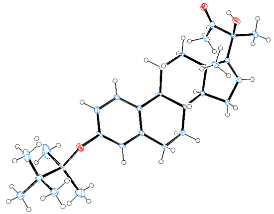 Moreover, the mixture of the key intermediate 11a and 11b was isolated from the reaction of epimeric cyanosilylated 9 with methyl lithium in ether at 0 °C. This diastereomeric mixture with ∆Rf equal to 0.1 was then separated by column chromatography (5% ethyl acetate in hexane) and, then, identified as (19R)-α-hydroxy methyl ketone (11a, 24.72% yield) and (19S)-α-hydroxy methyl ketone (11b, 36.78% yield). The assignment of the C-19 configuration of the hydroxyl group was made on the basis of 1H NMR and 13C NMR chemical shifts in this functional group as well as X-ray crystallographic analysis (Figure 2), and these data were compared to a CUCs side chain containing the function group reported previously by our research group [31]. 1H NMR showed a singlet signal at 4.07 ppm and 3.90 ppm corresponding to 11a and 11b, respectively. Surprisingly, the protected α,β-enone 8 was also detected in the mixture in 10.20% yield with an unknown mechanism.