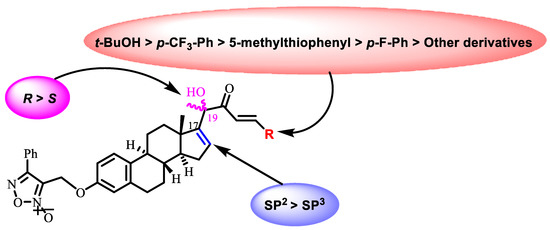 It is worth mentioning that the configuration around the C-19 played a crucial role in the biological activity among the most active compounds. Particularly, compound 14a with R-configuration showed higher activity than the corresponding S-isomer 14b in both HepG2 and HepG2-R cell lines. Moreover, compound 17a with R configuration around C-19 showed a potent cytotoxicity activity against the HepG2 cell line while the corresponding S-isomer 17b was inactive up to 50 µM. In addition, the anticancer activity showed a twofold increase against both the HepG2 and HepG2-R cell lines when the estratriene core in NO-CIEA I was replaced with estratetraene core in compound 14a, demonstrating the significance of ∆-16 unsaturation. Appending the furoxan moiety at C3, and utilizing the CUCs side chain at C-17, ring D unsaturation at C-16, and R configuration around C-19 can be suggested as vital elements for the growth inhibitory activity of the hybrids reported here, see Figure 3. In this context, the synthesized analogs are considered promising candidates for the treatment of HCC and overcoming the chemotherapeutic resistance.