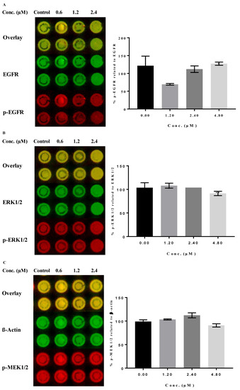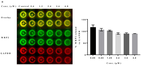 In-cell Western protocol on an Odyssey® imager (LI-COR®) was followed according to manufacturer’s directions [51,52,53,54]. Briefly, in clear-bottomed and black-walled 96-well plates, HepG2 cells were seeded (0.5 × 106 cells/mL) and allowed to grow to confluence. Then, cells were incubated for 24 h with different concentrations of compound 21a (0.6, 1.2, and 2.4 µM) and DMSO as control. Cells were then fixed, permeabilized, blocked, and incubated for 2 h with an antibody with gentle shaking and then incubated overnight at 4 °C. Cells were then washed and incubated with secondary antibodies conjugated to IRdye for 1 h. Finally, cells were washed 4 times, and the plate was blotted dry. Phospho-proteins were normalized for total protein signals while p-MEK1/2 and MRP2 were normalized for the β-actin and GAPDH loading controls, respectively, to correct for well-to-well variation in cell number and %inhibition determined relative to control wells. Data are expressed as mean values of at least two runs ± SD.