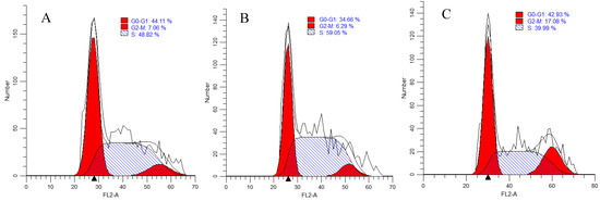 Flow cytometric analysis of cell cycle parameters: HepG2 liver cancer cells were incubated for 24 h; (A) control; (B) 2.4 µM (IC50) of NO-∆-16-CIEA 14a; (C) 8.1 µM (IC50) of NO-∆-16-CIEA 14b.