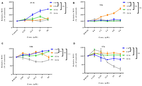 The levels of NO produced intracellularly from compounds 14a,b and 17a along with JS-K (a known NO donor prodrug) were examined using NO-sensitive fluorophore DAF-FM DA, (Figure 6A–D). It was observed that compound 14a showed a significant increase in fluorescence (2.9-fold compared to untreated cells) after 6 h of incubation in a dose-dependent manner and produced amounts of NO in tumor cells comparable to JS-K [16], which also showed a significant increase in fluorescence (2.9-fold compared to untreated cells) after 1 h of incubation in a dose-dependent manner. It was also found that compounds 14b and 17a showed a relative increase in fluorescence by about 1.38 and 1.13-fold compared to untreated cells (Control) after 1 h and 6 h of incubation in a dose-dependent manner, respectively. Furthermore, these results strongly suggest that compound 14a is a far superior source of controlled NO release in comparison with the reference prodrug JS-K.