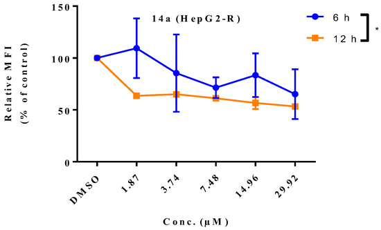 As compound 14a showed a good profile of anti-proliferative activity against both HepG2 and HepG2-R cancer cell lines, the study was extended to explore its mode of action using the In-cell Western assay (ICW). As shown in Figure 4, the Odyssey image shows the detection of total proteins regardless of phosphorylation status as well as the detection of decreasing amounts of phospho-protein as a function of increasing 14a concentrations, while the graphical representations show the quantification of fluorescence. The data reveal the slight activity for compound 14a after incubation for 24 h at a concentration of 4.80 µM to inhibit the phosphorylation of MEK1/2 and ERK1/2 (≈10% and 12% inhibition, respectively) compared to untreated cells (Control), whereas no effects were observed for phosphorylated EGFR. Surprisingly, 14a resulted in a significant reduction in EGFR phosphorylation in treated cells at a concentration of 1.20 µM with 43% inhibition. Furthermore, as shown in Figure 4, there is a significant reduction in MRP2 expression in the HepG2-R cell line [36] caused by compound 14a in a dose-dependent manner with 24% inhibition compared to control, demonstrating a significant impact on the chemotherapeutic resistance.