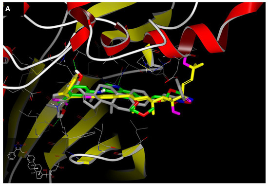 A molecular docking study was carried out to examine the binding modes of the designed compounds in the active sites of EGFR (PDB:ID 1M17), ERK2 (PDB:ID 5NHJ), MEK1 (PDB:ID 1S9J), and MRP1 (PDB:ID 2CBZ) using the OpenEye Scientific software [38], as shown in Table 5. Among the docked compounds, 14a scored the best Chemgauss4 scores within the target active sites [39]. As shown in Figure 8A, the FRED view of compound 14a inside EGFR active site showed an overlay with the co-crystallized ligand erlotinib in addition to the inverted binding mode to the lead NO-CIEA I with three hydrogen bonding formations between (1) C-19-OH and a hydroxyl group of THR:830:A with bond length of 1.54 Å, (2) C23-OH and a hydroxyl group of THR:766:A with bond length of 2.22 Å, and (3) C23-OH and a carbonyl group of LEU:764:A with bond length of 1.59 Å. Inside the active site of both ERK2 and MEK1, compound 14a scored the highest Chemgauss4 overlaying with the co-crystallized ligands with hydrophobic interactions as shown in Figure 8B,C, respectively. In the active site of MRP1, the compound 14a showed an overlay with the adenosine moiety of the ATP ligand, forming a hydrogen bond coming from C23-OH and the hydroxyl group of THR:666:A with bond length of 1.91 Å (Figure 8D).