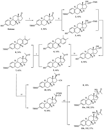 - Vincze, I.; L”okös, M.; Bakos, T.; Dancsi, A.; Mák, M. Steroids 49. Investigations on the dehydration of 17α-ethynl-17β- hydroxysteroids. Steroids 1993, 58, 220–224. [Google Scholar] [CrossRef] [PubMed]