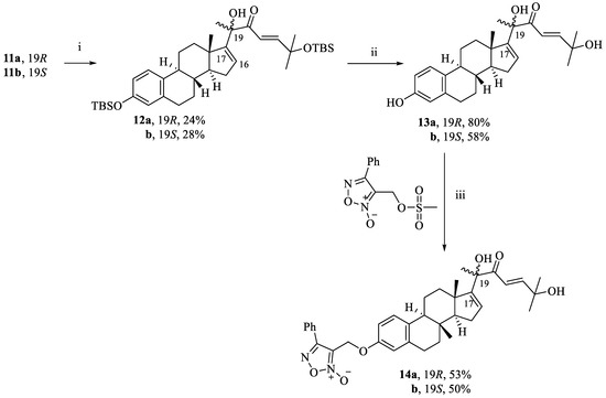 Synthesis of NO-∆-16-CIEAs 14a,b: (i) LDA, THF, −78 °C, 1 h, 2-((tert-butyldimethylsilyl)oxy)-2-methylpropanal, −78 °C to r.t., 20 h; (ii) TBAF, THF, r.t., 12 h; (iii) NaOH, THF, 3-(((methylsulfonyl)oxy)methyl)-4-phenyl-1,2,5-oxadiazole 2-oxide, reflux, 2 h.