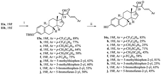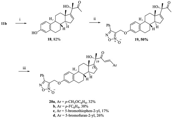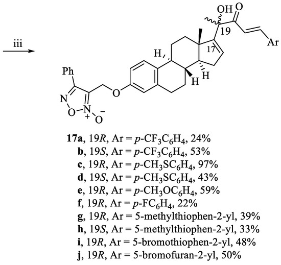 For more study about the SAR, the key intermediates α-hydroxymethylketones 11a,b were then reacted with aromatic or heterocyclic aldehydes through aldol condensation and in situ elimination using NaOH to afford cucurbitacin-inspired estra-1,3,5,16-tetraene analogs 15a–j. Deprotection and finally coupling with furoxan mesylate provided the target compounds 17a–j, Scheme 3.