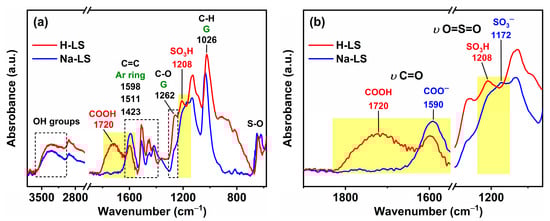 FTIR spectra of lignosulfonate samples (Na-LS and H-LS): (a) entire FTIR spectra, (b) enlarged FTIR spectra at a selected region (marked by yellow color).