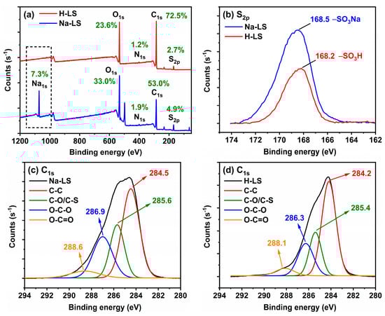 (a) XPS survey spectra of Na-LS and H-LS, (b) high-resolution S2p spectra of Na-LS and H-LS, (c) high-resolution C1s spectra of Na-LS, and (d) high-resolution C1s spectra of H-LS.