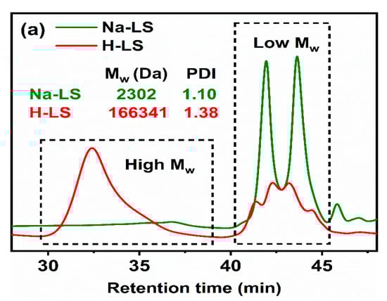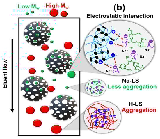 (a) GPC chromatogram of lignosulfonate samples (Na-LS and H-LS), as well as their apparent molecular weight and polydispersity. (b) An illustration of the electrostatic interaction of charged lignosulfonate with a column material.