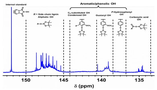 To fully understand its characteristics and provide useful knowledge for future applications, the chemical structure of lignosulfonate should be thoroughly investigated. Figure 4 displays the 31P NMR spectra of an H-LS sample after derivatization. This 31P NMR spectra were clearly separated into various regions that contain various kinds of hydroxyl groups, such as aliphatic, aromatic, and carboxylic acid hydroxyl groups. When compared with the aromatic and carboxylic OH, H-LS showed the most intensive peak of aliphatic OH groups, indicating that the lignosulfonate sample contains more aliphatic OH than aromatic OH. However, it is noticeable that the aliphatic OH peak was not uniform but rather overlapped with numerous small and sharp peaks, suggesting that some aliphatic OH may not belong to lignin structures. One of the most suspicious reasons is the presence of carbohydrate impurity [26] since carbohydrates contain aliphatic OH groups having chemical shifts at approximately 145–149 ppm [41]. Additionally, because the lignosulfonate was derived from softwood, the syringyl signal was scarcely detectable in the aromatic OH area of 31P NMR spectra.
