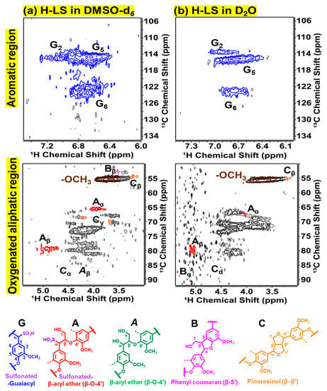 1H–13C HSQC NMR spectra of lignosulfonic acid (H-LS) sample recorded in different solvents: (a) DMSO-d6 and (b) D2O.