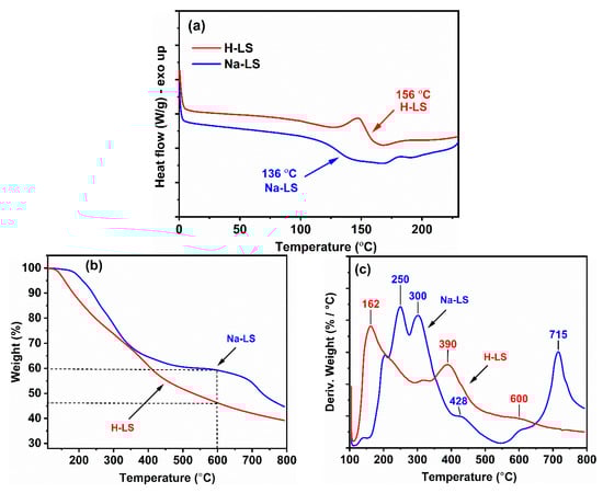 Thermal behavior of lignosulfonate samples (Na-LS and H-LS). (a) DSC thermograms, (b) thermogravimetric analysis (TGA) curves, and (c) the first derivative of the TGA (DTG) curves.