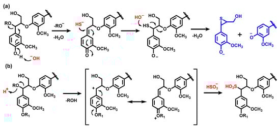 Chemical reactions occurred during (a) kraft pulping (cleavage of the β-O-4′ linkage) and (b) sulfite pulping (sulfonation reaction). Chemical reactions were adapted from Demuner et al. (2019) [40].