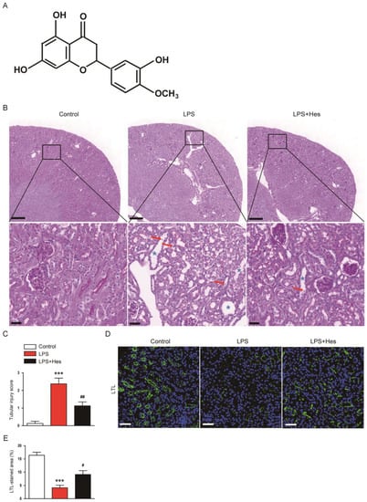 Hesperetin ameliorated histological abnormalities in lipopolysaccharide (LPS)-injected mice. (A) The chemical structure of hesperetin. (B) Periodic acid-Schiff (PAS) staining. Red arrows indicate detached tubular cells. Blue asterisks indicate dilated tubules. Scale bars: 300 μm (upper panel) and 30 μm (lower panel). (C) Tubular injury score. (D) Lotus tetragonolobus lectin (LTL) staining (green). Nuclei were stained with 4′,6-diamidino-2-phenylindole (DAPI; blue). Scale bar: 50 μm. (E) Percentage of the LTL-stained area per field. n = 8 per group. *** p < 0.001 vs. Control. # p < 0.05 and ## p < 0.01 vs. LPS.