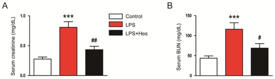 To assess renal function, serum creatinine and blood urea nitrogen (BUN) levels were analyzed [29]. Serum levels of these indicators were elevated after LPS injection but were attenuated by hesperetin (creatinine: LPS, 0.81 ± 0.09 mg/dL vs. LPS+Hes, 0.43 ± 0.06 mg/dL, p < 0.01; BUN: LPS, 115.9 ± 16.3 mg/dL vs. LPS+Hes, 68.9 ± 11.2 mg/dL, p < 0.05; Figure 3A,B).