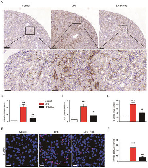 Hesperetin inhibited LPS-induced oxidative stress. (A) IHC staining for 4-hydroxynonenal (4-HNE). Scale bars: 150 μm (upper panel) and 50 μm (lower panel). (B) Percentage of the 4-HNE-stained area per field. (C) Renal malondialdehyde (MDA) levels. (D) Renal 8-hydroxy-2′-deoxyguanosine (8-OHdG) levels. (E) IF staining for 8-OHdG. Scale bar: 20 μm. (F) Number of 8-OHdG-positive cells per field. n = 8 per group. *** p < 0.001 vs. Control. ## p < 0.01 and ### p < 0.001 vs. LPS.