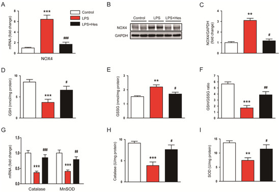 Oxidative stress can occur through an imbalance in pro-oxidant/antioxidant homeostasis [33]. Therefore, to explore the mechanism of hespertin’s inhibitory effect on LPS-induced oxidative stress, we next investigated the expression of pro-oxidant and antioxidant enzymes. LPS-injected mice exhibited increased mRNA expression of the pro-oxidant NADPH oxidase 4 (NOX4) enzyme (Figure 5A). However, hesperetin treatment significantly reduced NOX4 expression (LPS, 6.4 ± 0.8 vs. LPS+Hes, 1.7 ± 0.4, p < 0.001; Figure 5A). NOX4 protein levels were also reduced by hesperetin (LPS, 3.1 ± 0.2 vs. LPS+Hes, 1.2 ± 0.2, p < 0.05; Figure 5B,C). Moreover, hesperetin increased the amount of the endogenous antioxidant glutathione (GSH) (LPS, 3.7 ± 0.8 nmol/mg protein vs. LPS+Hes, 6.6 ± 0.9 nmol/mg protein, p < 0.05; Figure 5D) and the ratio of reduced GSH to oxidized GSH (GSH/GSSG; LPS, 1.7 ± 0.4 vs. LPS+Hes, 3.9 ± 0.5, p < 0.01; Figure 5F) in LPS-injected mice, while decreasing the amount of GSSG (LPS, 2.2 ± 0.2 nmol/mg protein vs. LPS+Hes, 1.7 ± 0.1 nmol/mg protein, p < 0.05; Figure 5E). LPS injection reduced catalase and manganese superoxide dismutase (MnSOD) mRNA levels, but they were markedly increased by hesperetin (catalase: LPS, 0.37 ± 0.05 vs. LPS+Hes, 0.85 ± 0.10, p < 0.001; MnSOD: LPS, 0.41 ± 0.04 vs. LPS+Hes, 0.79 ± 0.09, p < 0.01; Figure 5G). Catalase and SOD activities were also increased by hesperetin (catalase: LPS, 3.9 ± 0.8 U/mg protein vs. LPS+Hes, 7.6 ± 1.1 U/mg protein, p < 0.05; SOD: LPS, 7.4 ± 0.9 U/mg protein vs. LPS+Hes, 11.5 ± 1.5 U/mg protein, p < 0.05; Figure 5H,I).
