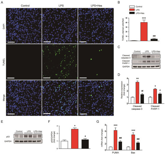 As apoptosis also plays an important role in septic AKI [8,9], we evaluated the effect of hesperetin on apoptosis using TdT-mediated dUTP nick end labeling (TUNEL) assay. LPS-injected mice displayed a higher number of TUNEL-positive cells (Figure 6A,B). However, these changes were mitigated by hesperetin (LPS, 40.5 ± 5.2 vs. LPS+Hes, 4.3 ± 1.6, p < 0.001; Figure 6A,B). Further, hesperetin reduced the protein levels of cleaved caspase-3 and cleaved poly(ADP-ribose) polymerase-1 (PARP-1) (cleaved caspase-3: LPS, 3.4 ± 0.2 vs. LPS+Hes, 1.5 ± 0.2, p < 0.01; cleaved PARP-1: LPS, 2.3 ± 0.1 vs. LPS+Hes, 1.6 ± 0.2, p < 0.05; Figure 6C,D). The expression of p53 transcription factor was also significantly decreased by hesperetin (LPS, 2.6 ± 0.2 vs. LPS+Hes, 1.2 ± 0.1, p < 0.05; Figure 6E,F). These changes were accompanied by reduced mRNA levels of its target genes, p53 upregulated modulator of apoptosis (PUMA) and Bax (Figure 6G).