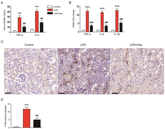 Hesperetin mitigated LPS-induced inflammatory responses. (A) Serum tumor necrosis factor-α (TNF-α) and interleukin-6 (IL-6) levels. (B) Renal mRNA expression of TNF-α, IL-6, and IL-1β. (C) IHC staining for F4/80. Scale bar: 30 μm. (D) Number of F4/80-positive cells per field. n = 8 per group. *** p < 0.001 vs. Control. ### p < 0.001 vs. LPS.
