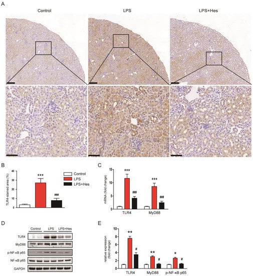 Hesperetin inhibited the Toll-like receptor 4 (TLR4)-MyD88-NFκB pathway. (A) IHC staining for TLR4. Scale bars: 150 μm (upper panel), 50 μm (lower panel). (B) Percentage of the TLR4-stained area per field. (C) Renal mRNA expression of TLR4 and MyD88. (D) Western blotting of TLR4, MyD88, and p-NF-κB p65. (E) Densitometric analysis of bands in (D). n = 8 per group. * p < 0.05, ** p < 0.01 and *** p < 0.001 vs. Control. # p < 0.05 and ### p < 0.001 vs. LPS.