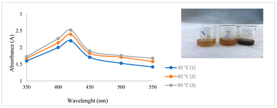 After CH-AgNPs were synthesized (Figure 1), they were characterized using various techniques in terms of shape, size, distribution, homogeneity and surface morphology. CH-AgNPs were characterized by UV–vis absorption spectroscopy (Figure 1) and it was determined that silver nanoparticles obtained at three different temperatures showed absorbance at 420, 425 and 427 nm. It was determined that the rate of change in color to dark brown was directly proportional to the increase in temperature. This situation was found to be compatible with the literature [28,29]. Fourier transmission infrared (FTIR) spectroscopy, energy dispersive X-ray analysis (EDX) and scanning electron microscopy (SEM) were also used for characterization of CH-AgNPs. CH-AgNPs synthesized at three different temperatures (30, 60, 90 °C) by green synthesis and particle sizes were found below 60 nm (Figure 2) in the scanning electron microscope at all three different temperatures and had a 2.8 keV peak, which showed the presence of Ag (Figure 3). The variation of reaction temperatures allows the particle size to decrease from 55 to 27 nm. The smallest particle size (27–29 nm) was observed at the highest reaction temperature (Figure 2). EDX is applied to analyze the dispersed size distribution in the liquid and the principal components of NPs, respectively [30,31]. However, when the energy dispersive X-ray (EDX) analysis was examined, it was determined that the nanoparticles were mainly composed of elemental silver (normalized atomic value 62.67%), and the C and O contents were relatively lower (Table 1).