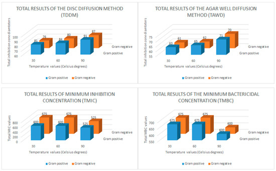 The disk diffusion method (DDM), the agar well diffusion (AWD) method, and minimum inhibition concentration (MIC) and minimum bactericidal concentration (MBC) tests were applied to determine the antibacterial effects of the CH-AgNP samples. During the disk diffusion method, 10 μL CH-AgNP sample was impregnated into discs (300 μg/mL). The results obtained after this assay showed that CH-AgNP samples inhibited all Gram (+) and Gram (−) pathogen samples, and it was observed that the diameters of these inhibition zones varied between 14 and 20 mm (Table 5). After that, in the AWD assay process, 8 mm diameter wells were drilled into the media (MHA, Merck, Darmstadt, Germany) and a previously prepared CH-AgNPs suspension (50 μL) at a concentration of 300 μg/mL was transferred to these wells. The obtained results after this application showed that CH-AgNP samples inhibit all target pathogen samples and it was observed that these inhibition zone diameters varied between 11 and 16 mm (Table 5). After AWD assays, MIC and MBC values were determined by the micro broth dilution method and it was observed that these values varied between 75 and 150 μg/mL. In order to easily interpret the data obtained from antibacterial activity tests, total results of the disk diffusion method (TDDM), total results of the agar well diffusion method (TAWD), total results of the minimum inhibition concentrations (TMIC) and total results of the minimum bactericidal concentration (TMBC) values were calculated. These total results are given in Figure 5.