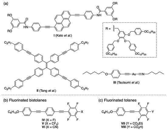 Chemical structures of (a) PLLC molecules I–III obtained from the literature [11,12,13] and (b) fluorinated bistolane-type PLLCs IV–VI [14,15] and (c) fluorinated tolane-type PLLCs VII and VIII developed by our group [16,17].