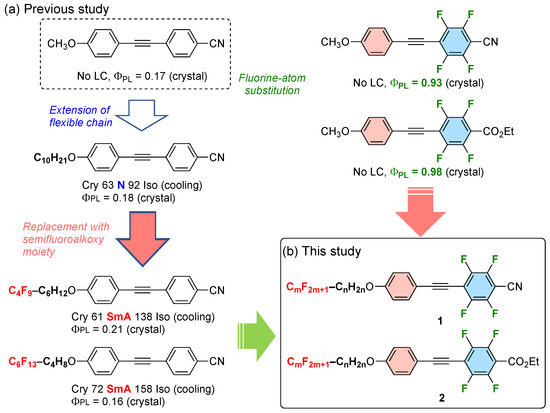 It has been shown that incorporating a semifluoroalkyl flexible chain unit into a mesogenic core is an effective molecular design approach to effectively express the Sm LC phase [18,19]. In fact, our recent study has reported that incorporating a semifluoroalkoxy fragment into D-π-A-type nonfluorinated tolane exhibits a smectic A (SmA) phase as well as weak photoluminescence (Figure 2a) [20]. Based on the knowledge of fluorinated PL molecules in our group, we conceived that a D-π-A-type fluorinated diphenylacetylene tolane containing a semifluoroalkoxy chain provides efficient PLLC molecules that exhibit efficient PL in the condensed phase (Figure 2b). In this study, we investigate the photophysical and phase transition behavior of two semifluoroalkoxy-containing D-π-A-type fluorinated tolanes, (1) 1 with a 2,3,5,6-tetrafluorobenzonitrile moiety and (2) 2 with a 2,3,5,6-tetrafluorobenzoate partial structure.