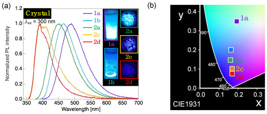 Moreover, CN-terminated 1 and CO2Et-terminated 2 exhibited PL even in the crystalline (Cry) phase. The PL spectra and CIE plot are shown in Figure 4, and the obtained photophysical data are summarized in Table 1.