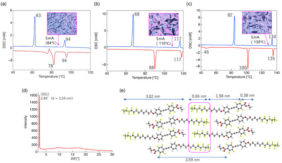 During the second heating process, 2a with a nonafluorodecyloxy chain (F content in the flexible chain: 54%) transitioned from Cry to mesophase at 80 °C and to Iso phase at 94 °C. The POM measurements revealed that the focal conic fan texture was in the mesophase; therefore, the observed mesophase was determined to be the SmA phase. Furthermore, 2c with a tridecafluorododecyloxy chain (F content in the flexible chain: 59%) also exhibited an SmA phase with a focal conic fan texture at a temperature range of 89–117 °C during the second heating process. Increasing the fluorine atom contents within the flexible chain structure broadened the LC temperature range. During the heating and cooling processes, 2d with a heptadecafluorotetradecyloxy chain (F content in the flexible chain: 62%) also exhibited an SmA phase, and the LC phase was observed to be in a range of 101–135 °C, which was wider than the others. To reliably identify the SmA phases observed in 2a, 2c, and 2d, temperature-variable powder X-ray diffraction (VT-PXRD) measurements were performed at the mesophase temperature. In 2a, which has a short fluoroalkyl moiety, no diffraction peak corresponding to the (001) plane index was observed (Figure S18a). It is considered that the fluorine atoms in the flexible chain formed an interdigitate structures, which formed many defects in the layer structure and reduced the domain size [24,25]. In contrast, 2b and 2c, which has an elongated fluoroalkyl structure, exhibited diffraction peaks corresponding to the (001) plane at 2θ = 2.46° and 2.22°, respectively (Figure 5d and Figure S18e). Using Bragg’s equation, the interlayer distances (d-spacing) in 2c and 2d were calculated as 3.59 nm and 3.97 nm, respectively. Considering the molecular lengths of 2c (3.02 nm) and 2d (3.28 nm) estimated by quantum chemical calculation (Figure 5e and Figure S26), it is anticipated that the structure in which the fluoroalkyl moieties are interdigitated and the π-conjugated mesogen is intercalated is the aggregated structure in the SmA phase (Figure 5e).