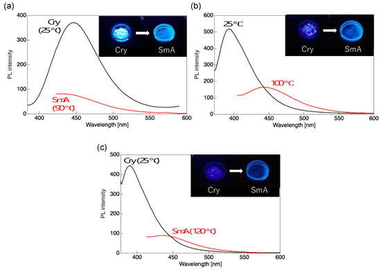 PL spectra of (a) 2a, (b) 2c, and (c) 2d in Cry and SmA phases. Excitation wavelength: 380 nm for 2a, 362 nm for 2c, and 392 nm for 2d.