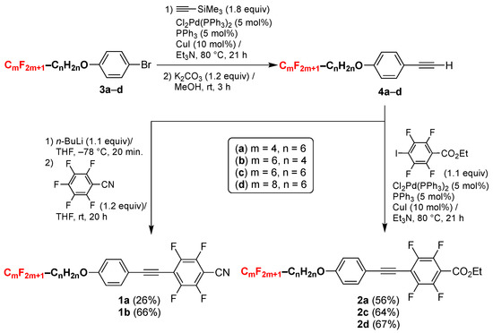Syntheses of CN-terminated 1 and CO2Et-terminated 2 were performed using the common synthetic intermediate 4, which was prepared by a Pd(0)-catalyzed Sonogashira cross-coupling reaction according to our previous report [16,20]. The CN-terminated molecules 1a and 1b were synthesized in 26% and 66% yield, respectively, via an addition–elimination reaction between pentafluorobenzonitrile and 4-semifluoroalkoxy-substituted phenylethynyllithium, which was readily prepared from 4. The CO2Et-terminated molecules 2a, 2c, and 2d were obtained in 56–67% yield through a Pd(0)-catalyzed Sonogashira cross-coupling reaction between 4 and ethyl 2,3,5,6-tetrafluoro-4-iodobenzoate. The resulting fluorinated tolanes were purified by silica gel column chromatography followed by recrystallization. Nuclear magnetic resonance (NMR) spectroscopic measurements showed that the purities of the resulting tolanes were suitable for evaluating their photophysical and phase transition behavior.