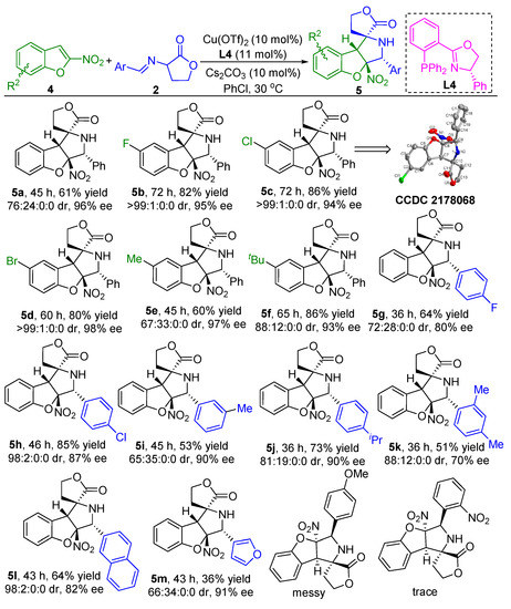 Having established a general scope to the catalytic asymmetric dearomative [3+2] cycloaddition reaction between 3-nitroindoles 1 and α-imino γ-lactones 2, we next attempted to apply the similar catalytic system to the asymmetric dearomative [3+2] cycloaddition reaction between α-imino γ-lactones 2 and 2-nitrobenzofuran substrates 4 (for details of the optimization of conditions, see the Supporting Information). As illustrated in Scheme 3, with the complex of Cu(OTf)2 and (S)-Ph-PHOX ligand L4 as the catalyst, Cs2CO3 as the base, the asymmetric dearomative [3+2] cycloaddition reaction of 2-nitrobenzofuran 4a and α-imino γ-lactone 2a smoothly proceeded in PhCl at 30 °C, furnishing the desired product 5a in 61% yield for the major diastereomer with 76:24:0:0 dr and 96% ee. As for the 2-nitrobenzofurans bearing various electron-withdrawing groups such as F-, Cl-, and Br- on the aryl ring, these substrates could work well in reaction with α-imino γ-lactone 2a under the standard conditions to give products 5b–d in 80–86% yields with excellent stereoselectivities (>99:1:0:0 dr and 94–98% ee). Likewise, 2-nitrobenzofurans bearing an electron-donating group were also viable for the developed protocol, as demonstrated in the synthesis of products 5e and 5f in good yields with 97% ee and 93% ee, respectively. On the other hand, the asymmetric dearomative [3+2] cycloaddition reactions of diverse α-imino γ-lactones containing either electron-withdrawing or electron-donating groups on the aryl ring with 2-nitrobenzofuran 4a could smoothly occur under the standard conditions, delivering the corresponding dearomative cycloaddition products 5g–j in 53–85% yields with good stereoselectivities for their major diastereomers (up to 98:2:0:0 dr and 90% ee). In addition, the α-imino γ-lactone with a double substitution pattern could also smoothly react with 2-nitrobenzofuran 4a under the standard conditions to generate product 5k in 51% yield for the major diastereomer with 88:12:0:0 and 70% ee. The bulky naphthyl group was also tolerated well with the catalytic system, resulting in the formation of product 5l in moderate yield with excellent diastereoselectivity and good enantioselectivity. Moreover, the 3-fury substituted substrate could smoothly react with 2-nitrobenzofuran 4a, delivering the corresponding product 5m in moderate yield with 66:34:0:0 dr and 91% ee. However, when para-OMe- or ortho-NO2-substituted α-imino γ-lactone was tested, no expected products could be obtained. The absolute and relative configuration of product 5c was determined to be C5R, C6R, C7R, and C8R by single crystal X-ray analysis, the configurations of all other products in Scheme 3 were assigned by analogy due to their formation via a common reaction pathway [49].
